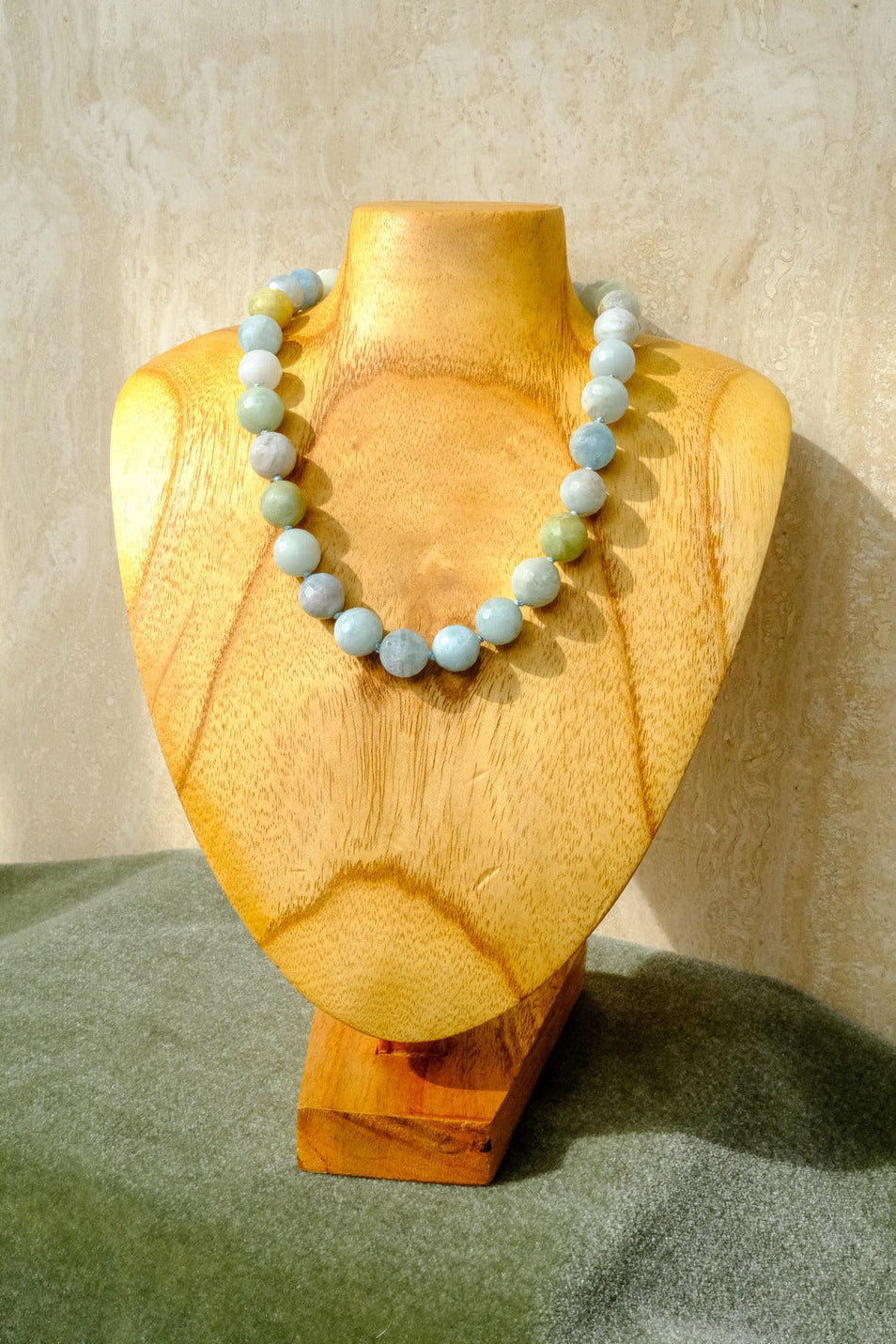 Natural Aquamarine shines in this silk knotted necklace. These strands contain naturally occurring blues, greens, yellow and whites.