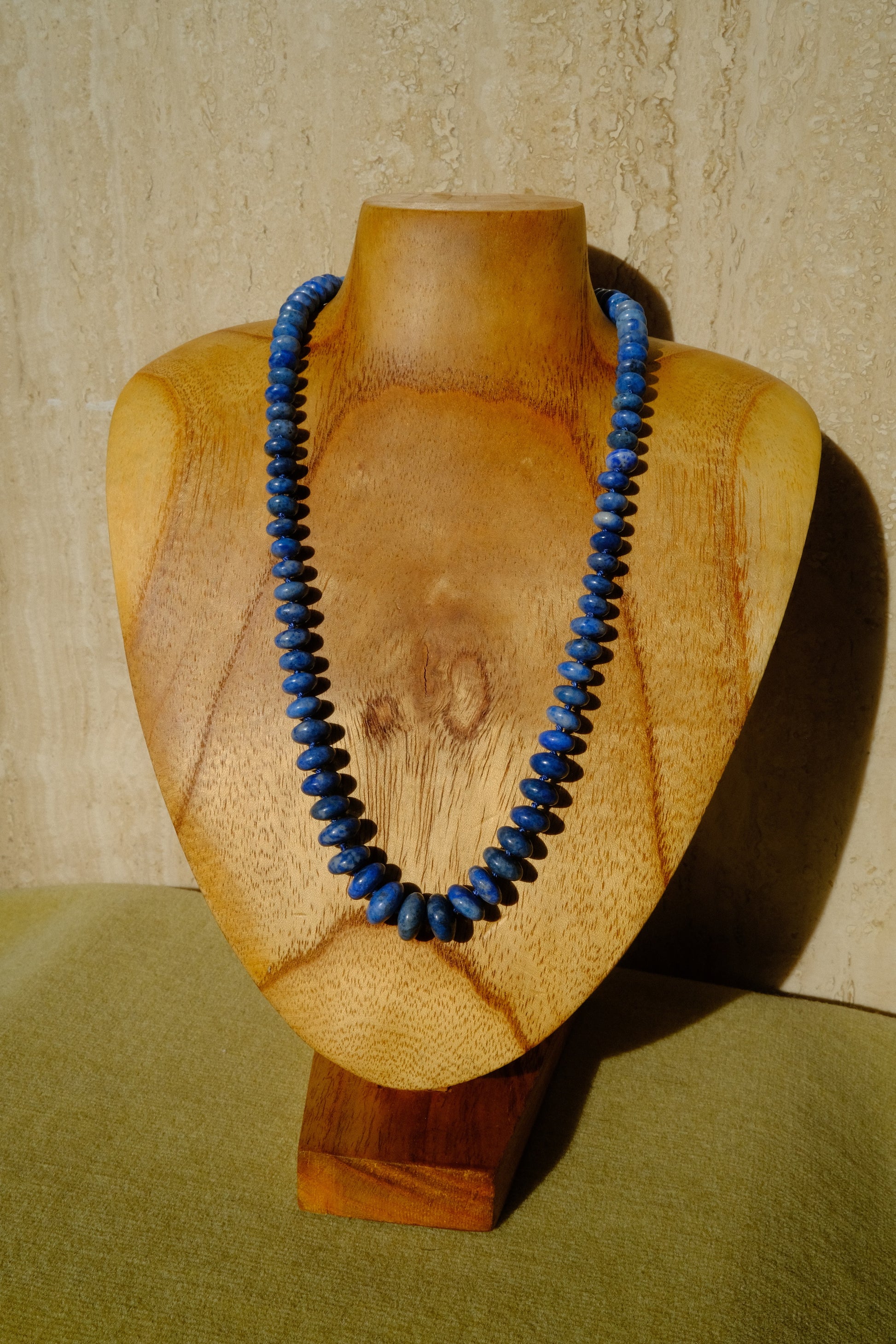 This luxuriously robust graduated denim lapis strand is punctuated by blue silk. A strong sterling silver magnetic clasp, bordered by citrine, keeps the stones secure.
